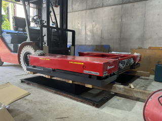 ガレージのリフト設置。思いのほか大変そうでクレーンリフトで運んでました